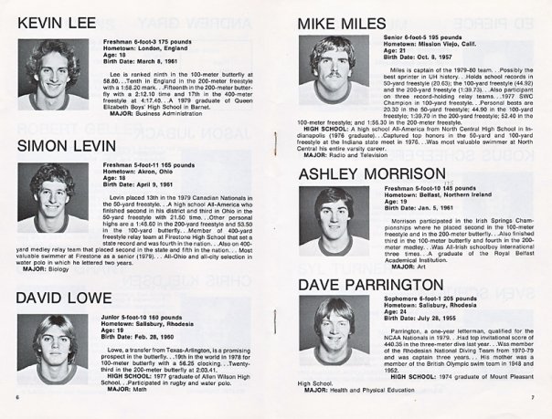 Rhodesian swimmers and divers in Dallas Texas in 1979. l to r. Guy Goosen, Dave Parrington, Dave Lowe, Debbie Hill, Kris Hammond (who dived for Rhodesia at the 1976 South African Championships in Durban, when he was an exchange student from the US attending Oriel).