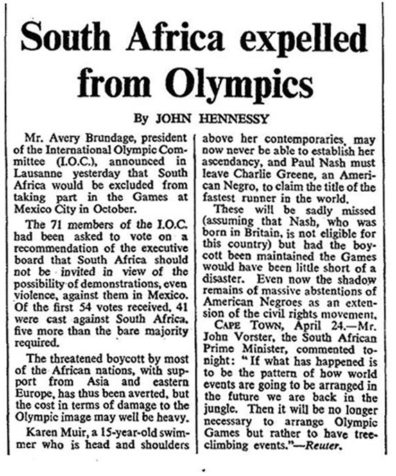 Now aged 15 Karen was in standard 8, and the big news was the possibility of South Africa being allowed to compete in the 1968 Olympic Games, after being barred from the 1964 Tokyo Olympics.