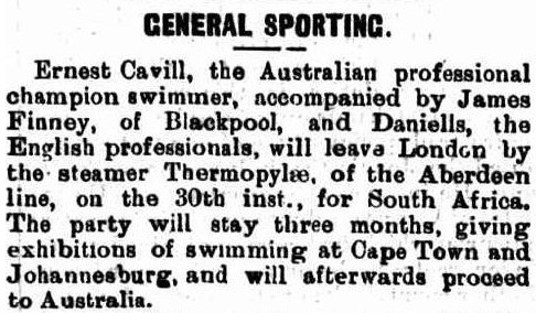 January 22, 1898:—Ernest Cavill (champion of Australia and America) leaves London by the Castle line steamer Hawarden Castle for Cape Town to-day (Saturday) with the intention of competing for the championship of South Africa. He is accompanied on his way by Mr. Frank Rhodes.