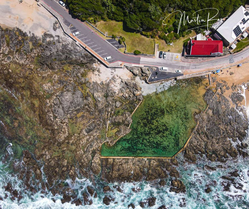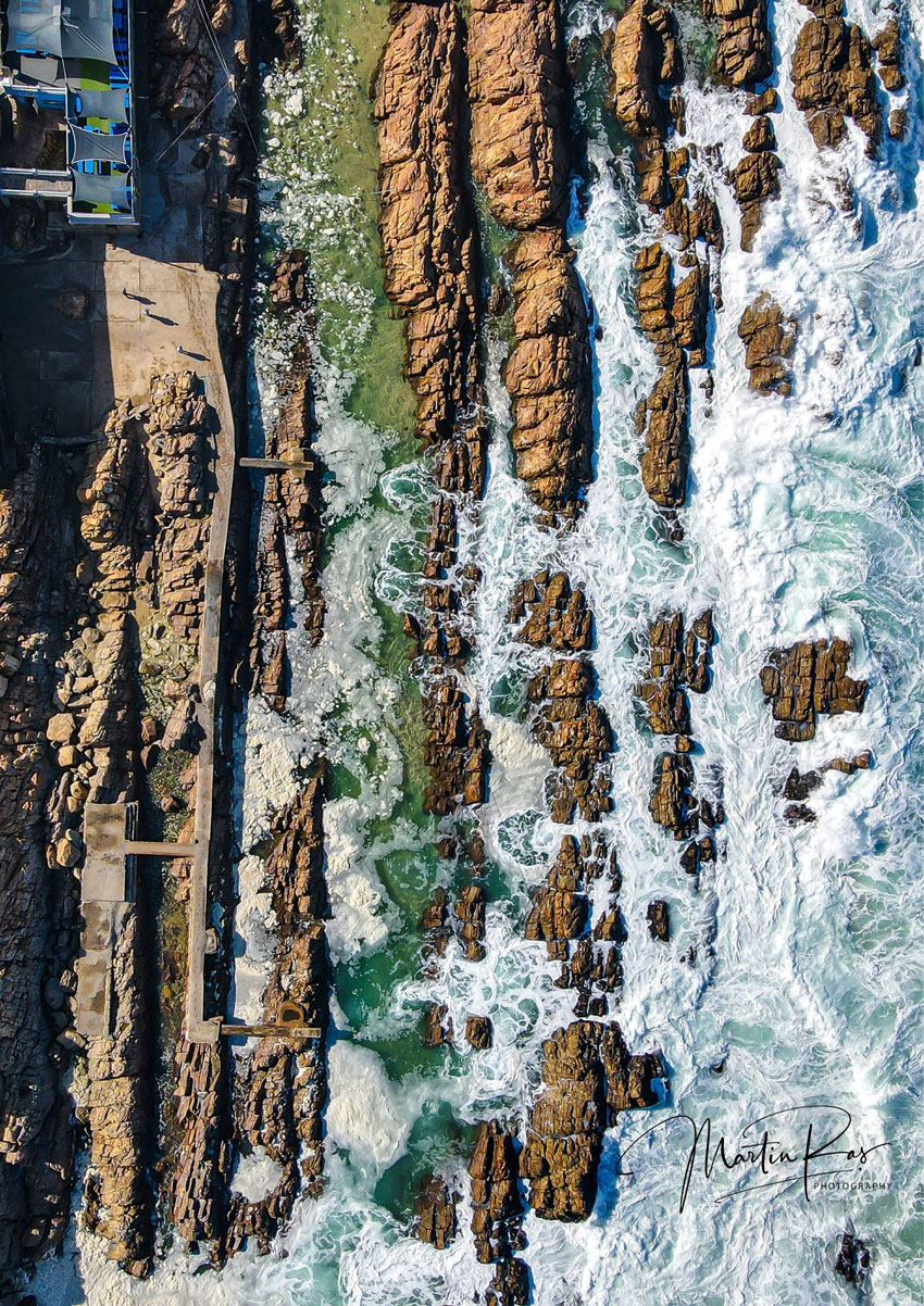 For generations, the town’s children have learned to swim in this tidal pool where chains and ropes have been secured to assist swimmers when the surging high tides cause strong currents to wash down the alley The pool has a smooth sandy bottom and the water of the Indian Ocean is mild, perfect for almost year-round bathing. It is deep enough for diving except at low tide. Swimming in the Poort’s live water, protected from the open ocean by the walls of rock with breakers thundering a stones’ throw away and showers of spray leaping in the air within sight is a rare sensation only to be experienced on a holiday in Mossel Bay. Martin Ras photography