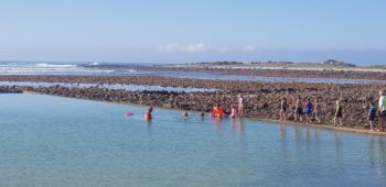 In the early 1930s a concrete wall was built across the opening of the cove, creating a tidal swimming pool. Waves break with considerable force into the pool and scour out sand and water that has stood for too long. As a result, swimming in the pool is a very refreshing experience. At present it is seriously under-utilised.