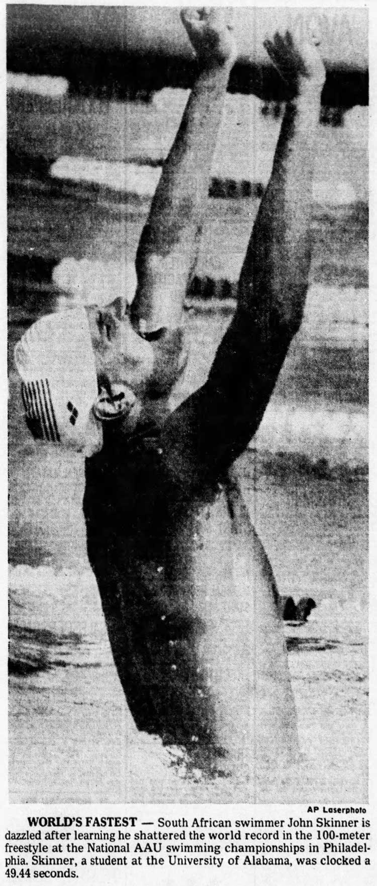 However, after the completion of the Olympics, at the 1976 United States, Summer National Swimming Championships in Philadelphia, Pennsylvania, and after just qualifying for the final, Skinner broke Jim Montgomery's 20-day-old world record in the 100-meter freestyle by 0.55 seconds beating home the Olympic champion and Joe Bottom who won silver in Montreal. His record stood until 3 April 1981 when Rowdy Gaines swam the distance in 49.36 seconds in Texas. In addition to his world record, he set three American records in the 100-yard freestyle.