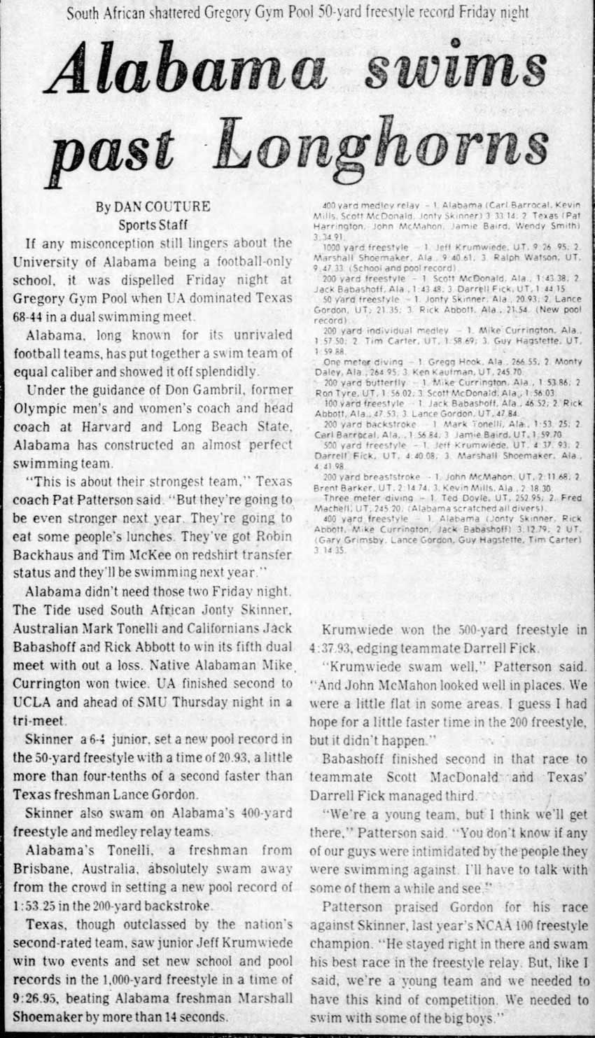 John Alexander Skinner, better known as Jonty, was born in South Africa, educated at Alabama and now coaches the San Jose Aquatic Club in California. He weighed 185 pounds, stood 6’5″ and was the fastest sprinter in the world, but it was 1976, and South Africa was non-grata in the Olympic Games. Jonty watched his friends go one, two, three in the Montreal Olympics on television.