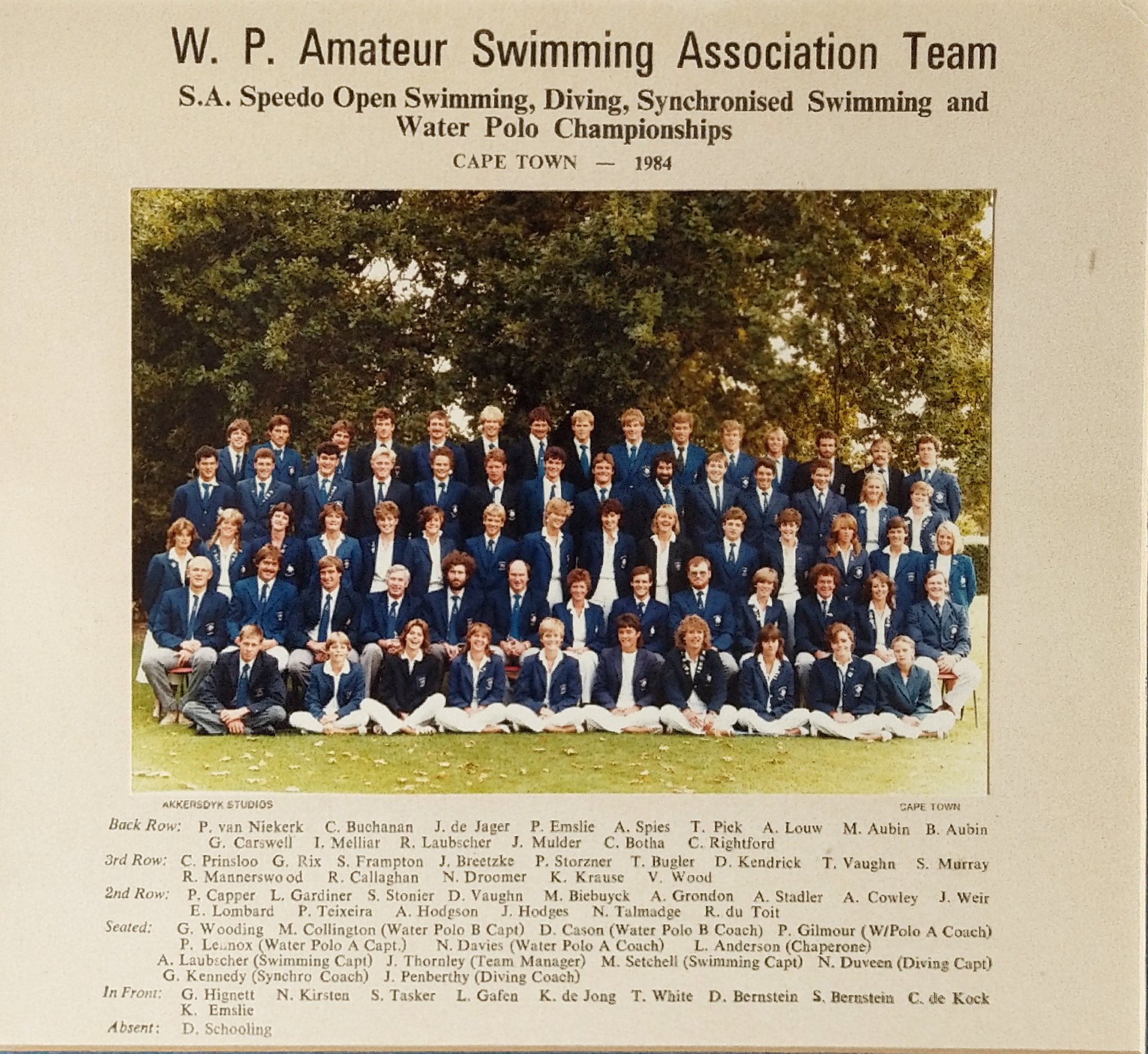 David Lowe in the 1977 Rhodesian national swimming team, in the middle row 6th from the right.