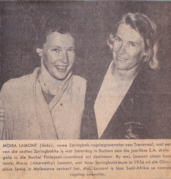 She swam in the 1956 Olympics (Melbourne) and was part of the ladies 4 x 100 freestyle relay team that won Bronze. This was the only medal SA won in swimming and our last Olympics swimming medals for a long while. The “Fab Four” consisted of- Natalie Myburgh, Susan Roberts, Moira Abernethy and Jeanette Myburgh. If one was a swimmer in the mid to late 50’s, these names were legendary. And still are.