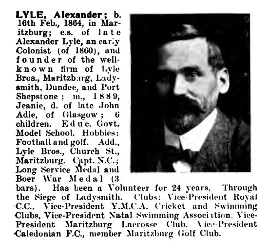 Herewith all I can remember. My grandfather, Alexander Lyle, started the Pietermaritzburg swimming club, which used to meet in the “ old quarry”. He was a sidestroke champion.