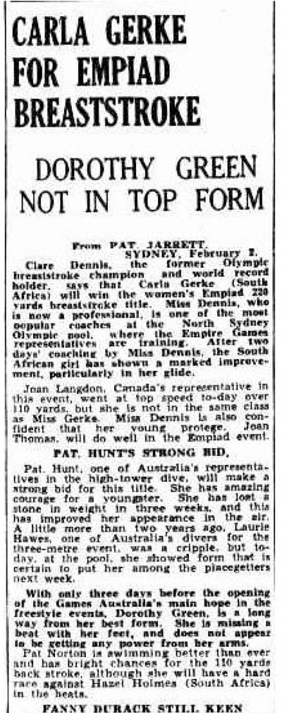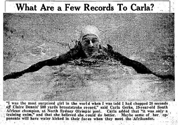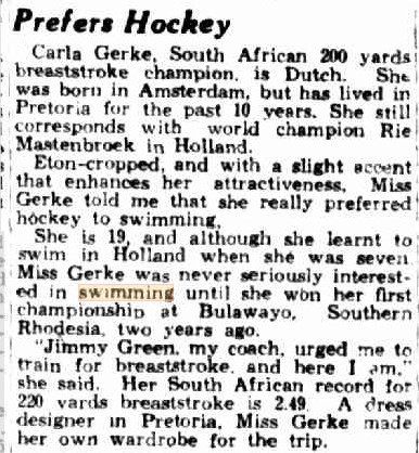 Carla was born in Amsterdam and moved to South Africa 1928. She learned to swim in Holland and had contact with world champion Rie Mastenbroek. In Pretoria, her coach was Jimmy Green.