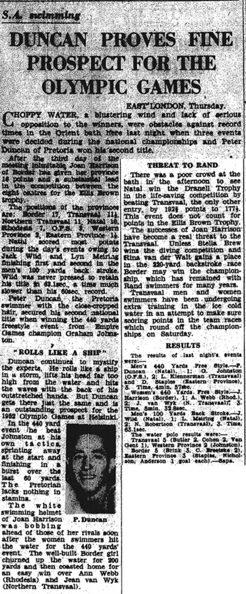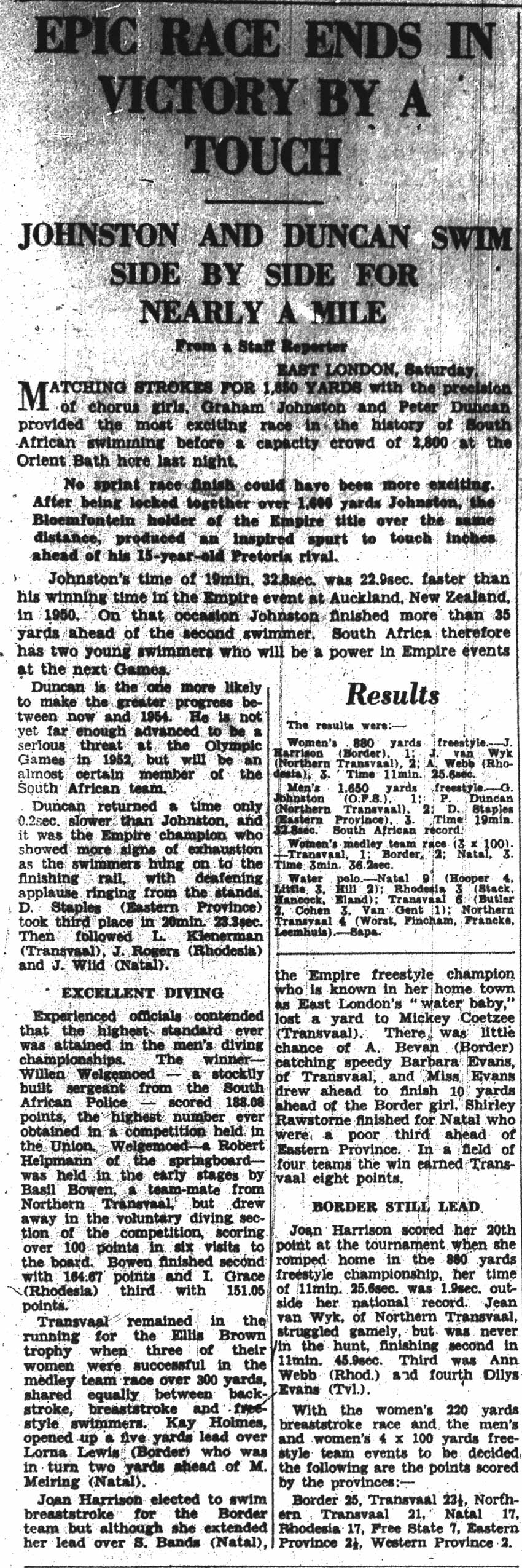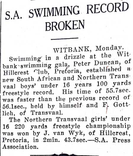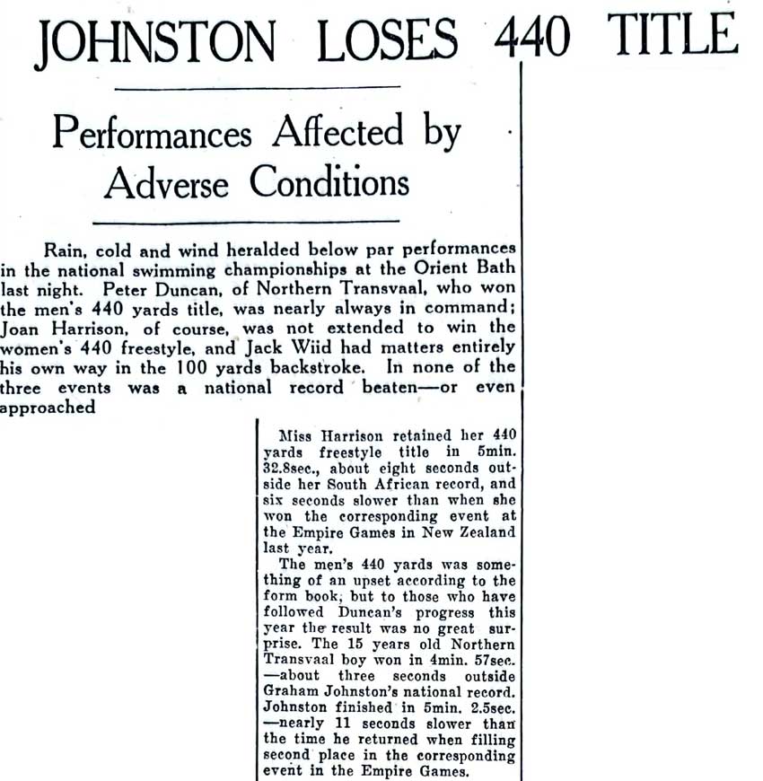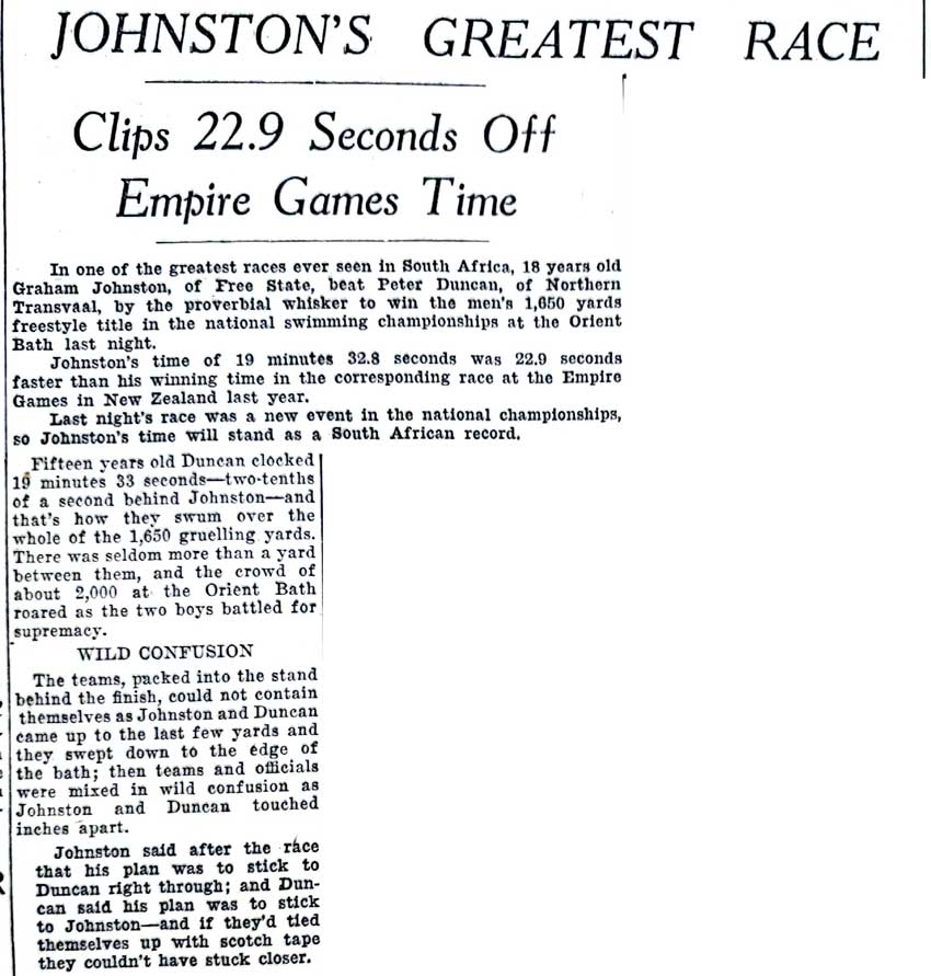 South African Swimming Championships held in East London in 1951, where Peter Duncan challenged the legendary Graham Johnston in the 1650 yard freestyle. Johnston went on the win the event at the 1952 Empire Games, beating Duncan into second place.