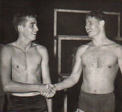 Peter Duncan congratulated by Les Klenerman in February 1951.