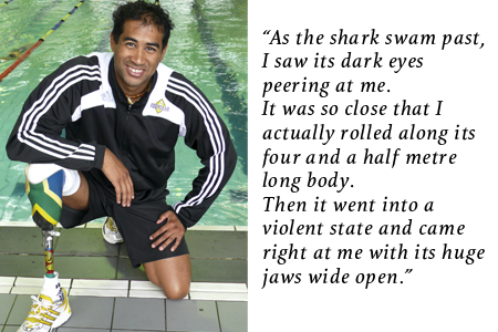 In 2006, his right leg was severed by a four-and-a-half metre long great white shark whilst he was training for lifesaving exams at Muizenberg beach with his brother Tariq; the lower portion of his leg was subsequently amputated.