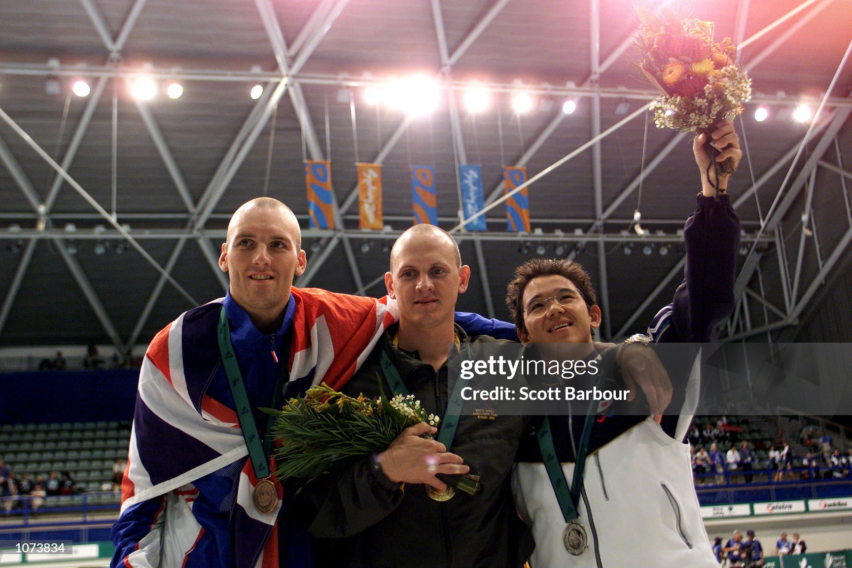 24 Oct 2000: Darren Leach (bronze)of Great Britain, Ebert Kleynhans (gold)of South Africa and Yoshikazu Sakai (silver) of Japan during the medal presentation for the Mens 100M Freestyle S12 Final held at Olympic Park during the Sydney 2000 ParalympicGames, Sydney, Australia.