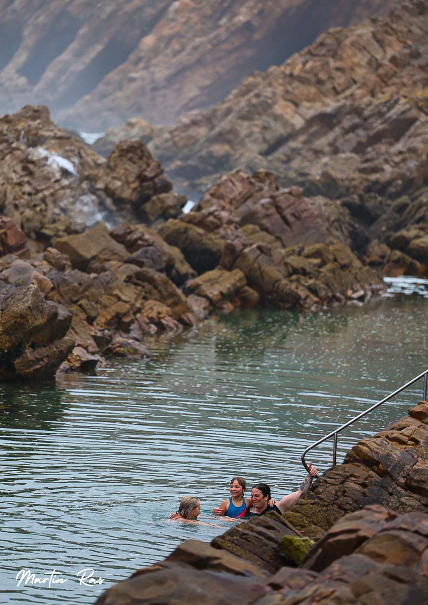 For generations, the town’s children have learned to swim in this tidal pool where chains and ropes have been secured to assist swimmers when the surging high tides cause strong currents to wash down the alley The pool has a smooth sandy bottom and the water of the Indian Ocean is mild, perfect for almost year-round bathing. It is deep enough for diving except at low tide. Swimming in the Poort’s live water, protected from the open ocean by the walls of rock with breakers thundering a stones’ throw away and showers of spray leaping in the air within sight is a rare sensation only to be experienced on a holiday in Mossel Bay. Martin Ras photography