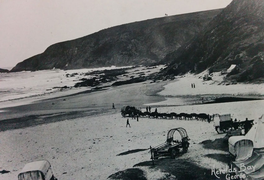 Vleesbaai is a private beach village situated on the Garden Route, approximately 35 km west of Mossel Bay. The modern history of Vleesbaai can be traced back as far as 1601, when stormy weather forced the Dutch mariner and explorer Paulus van Caerden to seek refuge in the protected bay now known as Vleesbaai.  He was so pleased with the well-fed livestock which he was able to trade from the local inhabitants that he named it “Vleys Baeye”, the Old Dutch word for Vleesbaai, directly translated into English as “Bay of meat”. By the late ninteenth century holiday-makers from as far as Calitzdorp began to visit Vleesbaai for their holidays. They camped near the freshwater fountain at the Tarka ravine and came with donkey-carts and ox-wagons, often accompanied by chickens, sheep and even milch-cows to supplement their food supply. These visitors can be considered as the first proverbial “Vleesbaaiers”.