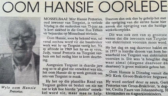 There are two tidal pools built on Reebok Strand, named after the two dorpies of Reebok and Tergniet.  Located between the Klein Brak Rivier and the Groot Brak Rivier, Tergniet (together with the adjacent village of Reebok) likely developed from the ‘Old Klein Brak’ village, the settlement in the middle of the Klein Brak River floodplain, which would have been a historic crossing point.