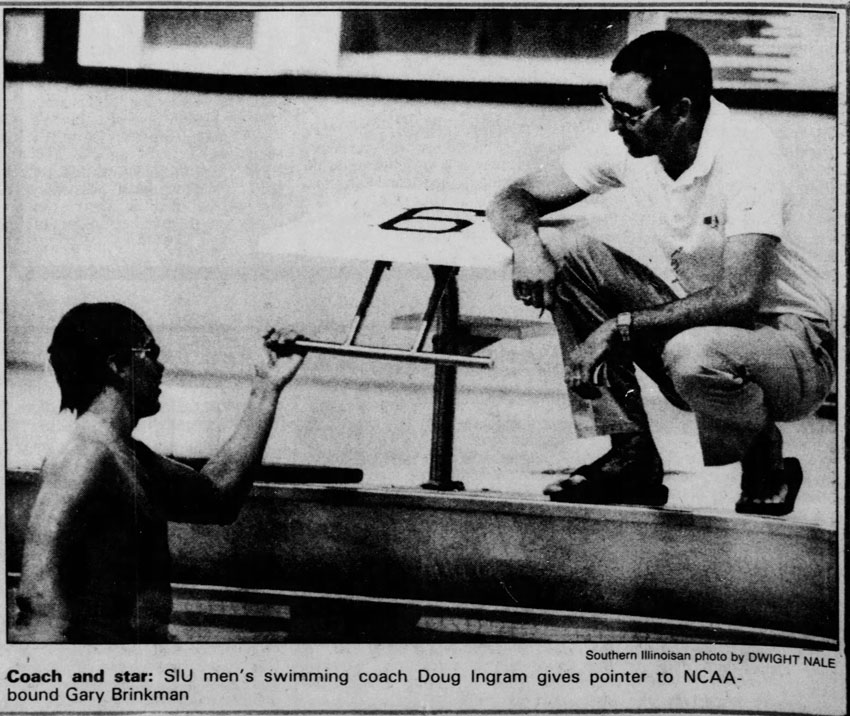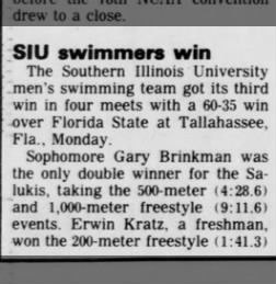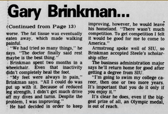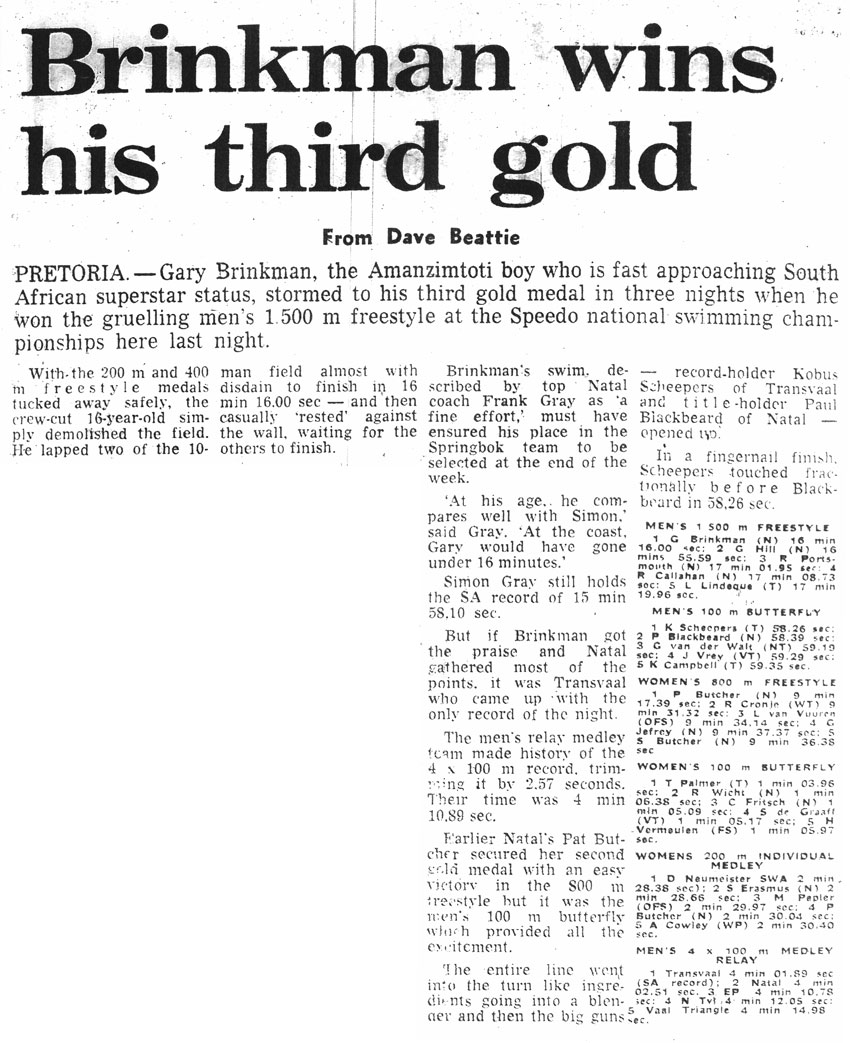 In 1981 and 1982 he won the Midmar Mile. At the South African swimming championships in 1982, Gary won three gold medals. In January 1983 Gary Brinkman took up a scholarship and joined fellow Springboks Erwin Kratz and Gerhard van der Walt to swim for the University of Southern Illinois, and by 1984 he had already won a US national swimming title. At the US nationals in August, he won the 400m freestyle in 3:55, 24., which was a significant improvement on his winning time at the South African Championships in Pretoria in 1982 was 4:10,79.