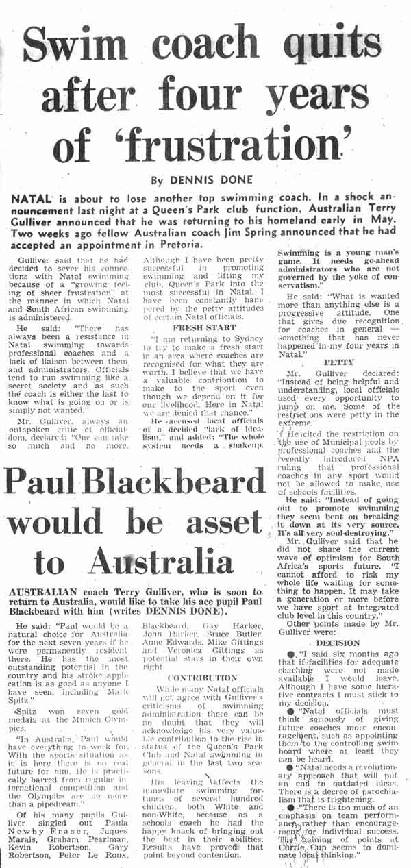 Paul Blackbeard's bio in the Springbok surf lifesaving team - Occupation - Policeman (age 22) - Member of the Pirates Surf Living Club. Triple Springbok - earned National Colours for Surf Lifesaving, Stillwater swimming and Lifesaving. Holder of numerous South African swimming records and world record holder for Stillwater Lifesaving event. Undefeated individual Surf Swim Champion from 1975 - 1979. South African Belt Swim Champion 1975, and Victor Ludorum in 1979. Toured USA in 1979 with Springbok team.