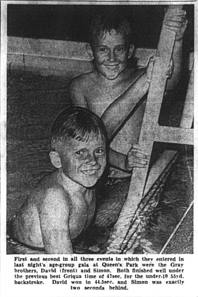After moving to Kimberley from Watford in England, the Gray brothers began to compete in the Kimberley age group galas. By age 10 Simon had qualified to swim at the South African swimming championships, dominating South African age group swimming for the next 8 years.
