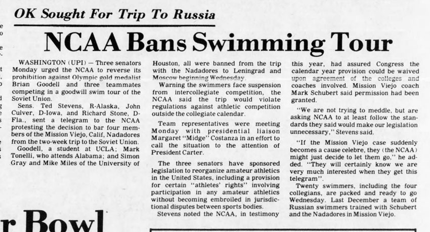 He won a swimming scholarship at the University of Houston and swum at the Mission Viejo Nadadores club in California while in the USA between 1977 and 1979.