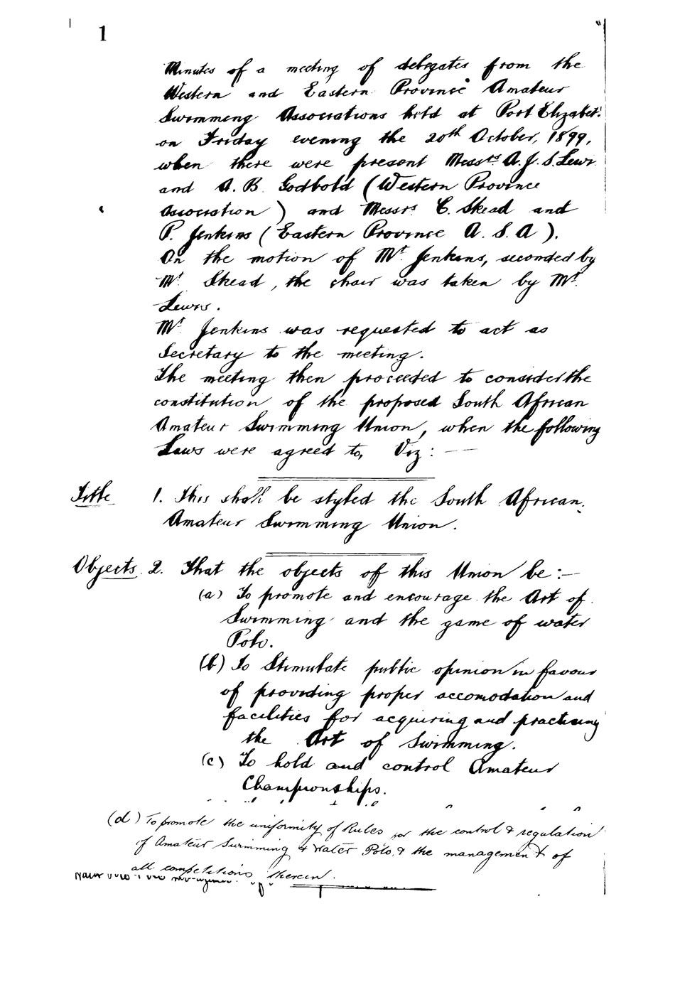 Western Province ASA and Eastern Province ASA were the only affiliated Provinces of the SAASU at the first national water polo championship event held at Port Elizabeth in 1900.