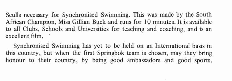In 1972 South Africa was one of 14 countries that held a national Championships for synchronised swimming.