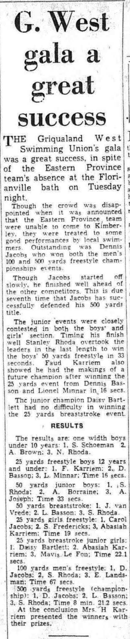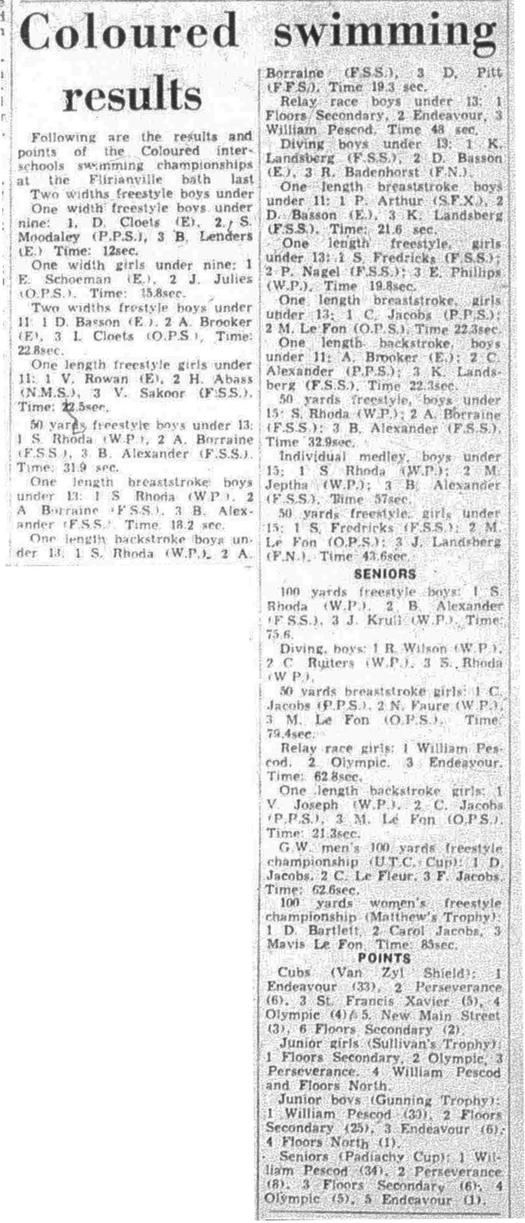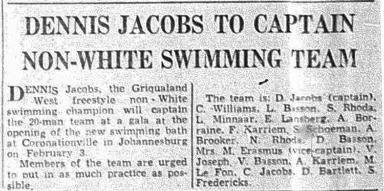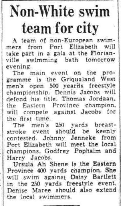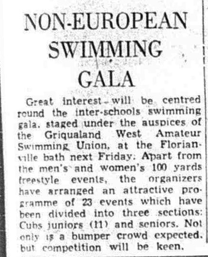 Note that this article is not in any way a complete or official history of non-white swimming in South Africa, based on publicly available material from the internet and newspaper archives.