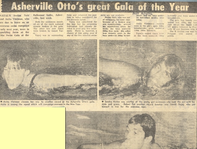 In fact, in the early days of non-racial swimming, with limited resources at our disposal (the first swimming facility for Black people in Natal was the Balkumar Singh Pool opened in 1956), the commitment of coaches, swimmers and administrators resulted in performances that were comparable with our privileged white counterparts. Swimmers such as Ismail Vayej and Seelan Nair were producing times that were as good as the wonderboy of white swimming, Paul Blackbeard. Griqualand West Amateur Swimming Association’s young star, Brian Hermanus, was producing times that would have obtained him a place in the finals of 1972 Olympics.